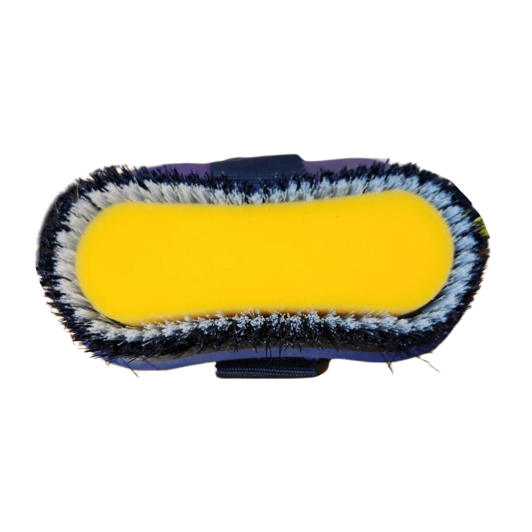 Soft, absorbent sponge center surrounded by medium stiff bristles to scrub out dirt.